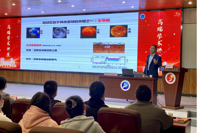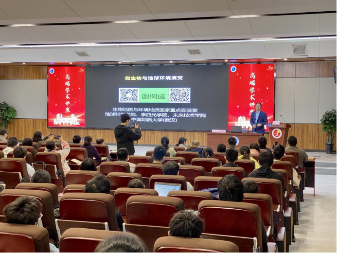 随后谢树成院士在图灵报告厅做了题为“微生物与地球环境演变”的学术报告。谢院士循序渐进、深入浅出的介绍了地球演化进程中地质微生物的重要性和挑战,提出利用地质脂类来识别岩石保存的地址微生物功能群的新方法。并以湖北神农架大九湖湿地作为典型介绍了一系列反映干湿变化的微生物新指标,提出消除碳排放的泥炭藓和共生微生物的恢复和保护策略;谢院士还在目前新冠病毒大流行的背景下介绍了地质病毒与古气候的关系,指出地质病毒未来重要突破方向。谢院士就老师们和同学们的提问进行了详细解答,并与师生分享了他在团队建设、人才培养等方面的宝贵经验。