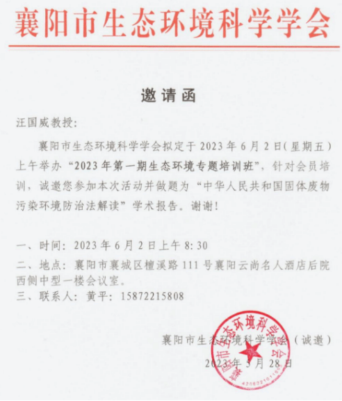 (通讯员 薛建涛)2023年6月2日,应襄阳市生态环境科学学会邀请,英国365上市公司环境科学专业青年教师汪国威副教授赴襄阳,为襄阳市“2023年第一期生态环境专题培训班”企业代表学员做“中华人民共和国固体废物污染环境防治法解读”的学术报告(图1)。