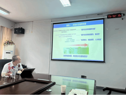 徐军研究员在介绍我国第十一至第十三五水专项研究内容和分析典型流域水环境治理案例基础上,对淡水生态修复效果进行了解析,并评估了修复潜力。他强调,清淤后的沉水植物种植能够维持较低的水体营养盐浓度,尽管改善效果有限。此外,水质改善与不同类型的治理工程之间存在差异,并且与投资量不一定成正比。研究还发现,静水生态系统对治理的响应明显高于流水生态系统,小型静水生态系统更易于治理,未来需要加强生物链方面的技术储备。徐军研究员还鼓励本校员工报考中国科公司水生生物研究所研究生,会议最后,他详细回答了与会者提出的问题。