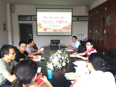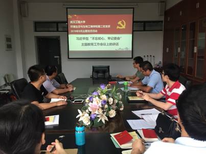 党支部书记杨浩接着对支部主题党日活动要求进行了详细解读,分别从指导思想、活动安排、主要内容、实施步骤和具体要求等5个方面来阐述,强调了每一次主题党日活动的重要性,希望党员们认真对待,严守活动纪律,服从组织安排。最后,党员同志们围绕着庆祝中华人民共和国成立70周年活动、武汉军运会以及近期的教学科研活动进行了相关讨论,大家一致表示要认真学习习近平总书记在“不忘初心,牢记使命”主题教育工作会议上的讲话精神,对照党章党规,对照先进典型、身边榜样,找一找在工作中存在的差距,有的放矢进行整改。