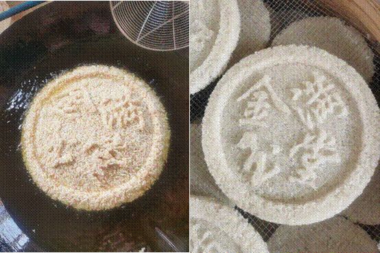在观赏舞龙狮表演结束后,实践团成员被一股香气所吸引,找到了玉林在春节期间特别提供的时令小吃“米花”,也叫白散,吃起来又香又甜,既酥又脆,令人回味无穷。实践团成员了解到,白散是玉林人最具有代表性的传统年货之一,也是招待客人的必需品。圆圆的白散象征着“合家团圆”,玉林人对和谐、吉祥的中国传统“和”“合”观念根深蒂固,白散中间有“福、寿、囍、吉”之类的喜气字,是恭祝大家在新的一年“福多、寿长、禄多、喜悦”。