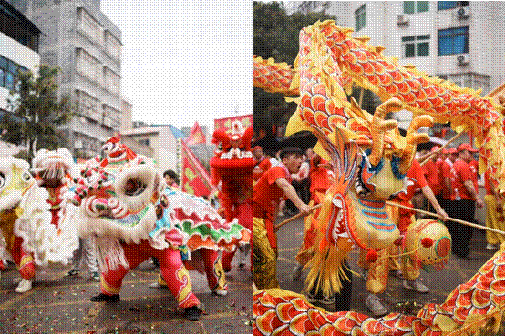 接着视线转向实践团的第二站——广西玉林,实践团成员观看了一场酣畅淋漓的舞龙狮表演,只见数只醒狮穿插而进,时而跳跃、时而翻滚,完成“采青”“吐瑞”等多个美好寓意的动作,紧接着巨龙在场中蜿蜒游动,表达着对新年的美好祝福。玉林舞狮舞龙文化是一种历史悠久且独具特色的传统舞蹈艺术。每逢春节、三月三、寒山诞等重大节庆日及祭祀活动,人们都会通过舞狮舞龙来祈祷消灾除害、求吉纳福。