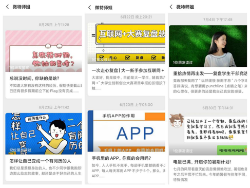 2020年6月起,团队成员通过精心设计和编辑制作,发布多篇微信公众号原创推文,助力老员工暑期居家学习和健康成长,为老员工提供学业指导、生涯规划、提升技能等,依托微信公众号,团队成员撰写了《老员工如何平衡学习和工作?教你4个小Tip!》《一次走心复盘|大一新手参加互联网+大赛》、《三十而已,二十何惧未来?》、《答应我,好好照顾身体》、《怎样让自己变成一个有阅历的人》、《总说没时间,你缺的是啥?》等员工喜爱的20余篇网文,为了员工提供思想引领、创新创业大赛介绍、学习和生活的平衡、职业规划等方面的指导。