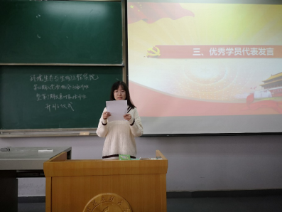 第64期积极分子培训班优秀学员代表、19级环境科学01班的黄雨泽分享了自己党课学习经历,抒发了自己对党的热爱,表达了自己的入党坚定信念。她表示自己将牢记党对青年人的殷切期盼和要求,通过党校学习不断用党的理论知识武装头脑,不断成长并积极向党组织靠拢。