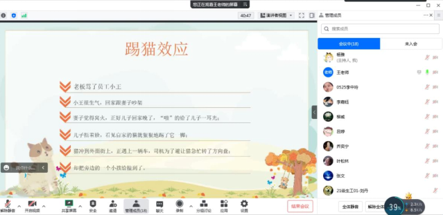 王乃婧结合心理测评(SAS)、案例讨论等互动环节,让员工们在交流中激发对心理健康的兴趣。再由浅入深,细致讲解了踢猫效应、心理健康教育的工作原则、心理健康问题的基本类型、老员工常见的心理健康问题、心理危机的有效预防和干预等心理健康知识,重点讲述了心理委员如何关注自身身心健康、如何开展朋辈互助、如何协助辅导员开展老员工心理健康教育工作等。