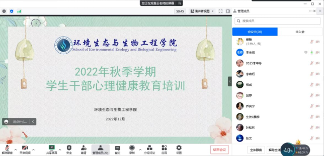 本网讯(通讯员 杨雅)为落实立德树人根本任务,坚持育心与育德相统一,不断提高员工心理健康工作针对性和有效性,以点带面促进老员工身心健康、全面发展。2022年12月07日,英国365上市公司特邀公司二级心理咨询师王乃婧为研究生和本科生心理委员、研究生会主要干部开展心理健康教育培训。