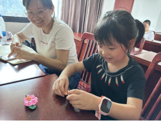 宣讲结束后,志愿者们教小朋友们用黏土DIY玫瑰花。小朋友们跟随志愿者的讲解逐步搓团、按压、粘合,并发挥自己的想象力和创造力,装饰自己的“小小花篮”。完成后小朋友踊跃走上讲台,勇敢自信地向大家展示并介绍自己DIY的一件件五彩斑斓的手工作品。