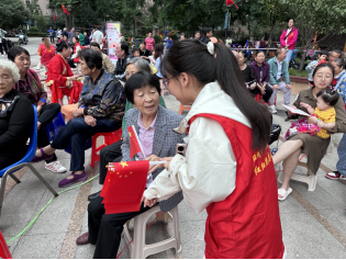 另一组志愿者积极配合社区工作人员,为文艺庆典的顺利开展保驾护航。志愿者们贴心地引导社区居民文明就坐观看双节演出,并与居民友好交流,为他们发放小礼品,努力营造出欢度双节的愉快氛围。