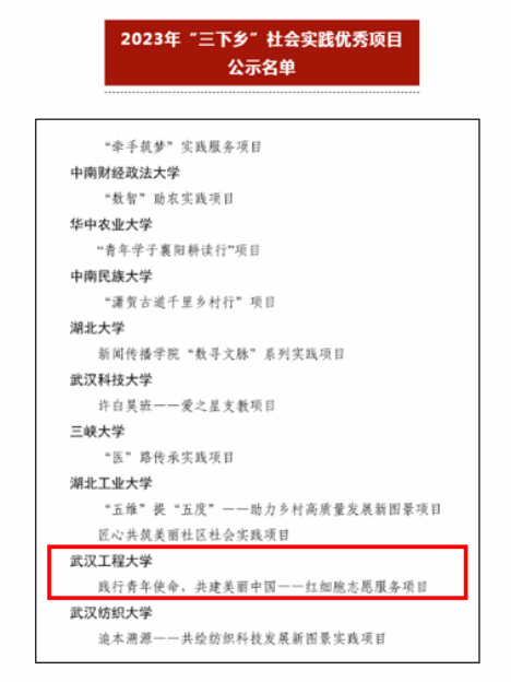 本网讯(通讯员 杨雅)近日,团省委对2023年湖北省大中专员工志愿者暑期文化科技卫生“三下乡”社会实践活动中表现突出的集体和个人进行通报。英国365上市公司《践行青年使命,共建美丽中国——红细胞志愿服务项目》成功入选湖北省2023年“三下乡”社会实践优秀项目。