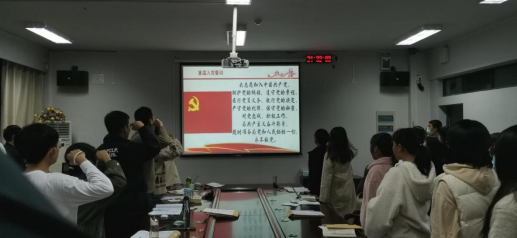 会议伊始,全体员工党员起立奏唱国歌,并在黄雨泽同学的带领下重温入党誓词。