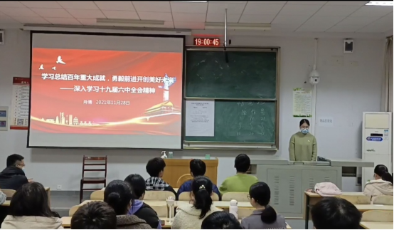 2019级研究生尹莉慧同学围绕“百年历程创造四方面伟大成就”、“百年历程带来四方面改变”、“总结成就的三方面意义”和“回答两个重要问题”四个方面对十九届六中全会精神展开讲解。向全体同学发出了“时代是出卷人,我们是答卷人,人民是阅卷人,我们一定要继续考出一个好成绩,在新时代新征程上展现新气象新作为”的号召。