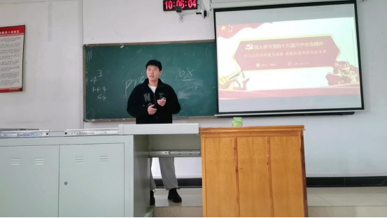 2019级生物技术专业的肖倩同学从会议背景、会议内容两个方面切入主题,深入浅出的为同学们讲解十九届六中全会精神。呼吁广大同学要更加紧密地团结在以习近平同志为核心的党中央周围,继续谦虚谨慎、戒骄戒躁,继续艰苦奋斗、锐意进取,为实现第二个百年奋斗目标、实现中华民族伟大复兴而奋力拼搏,为人类和平与发展的崇高事业不断作出新的更大贡献!