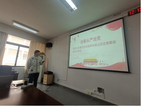 2020级环境科学专业员工党员陈志强为全体党员讲述关于“全面从严治党——探索出依靠党的自我革命跳出历史周期率的成功路径”的微党课,号召同学们学习从严治党有关精神,强化党的组织和政治纪律,自我审视,自我革新,更加紧密地团结在以习近平同志为核心的党中央周围,从学习、工作和日常生活方面出发,严于律己,更加自觉地坚定“四个自信”,做到“两个维护”为夺取全面建设社会主义现代化国家新胜利贡献力量。