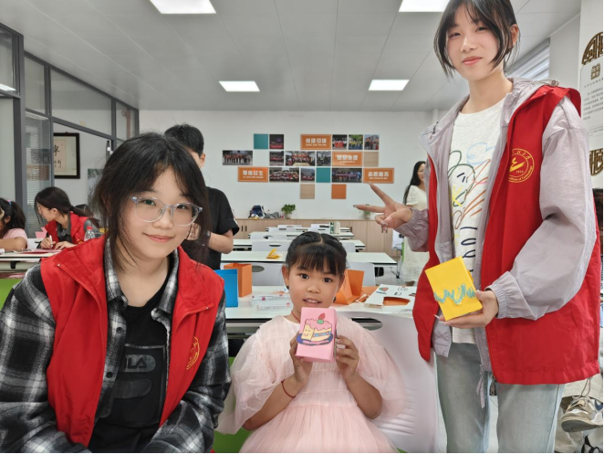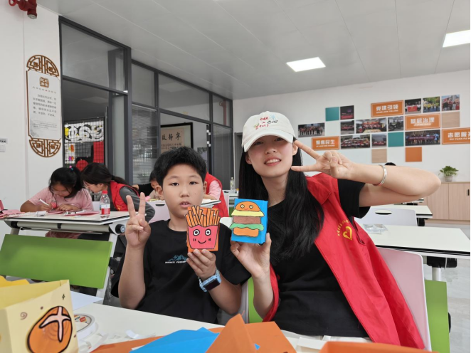 手工环节中,志愿者带领孩子们以废旧卡纸为主要材料,巧手制作“环保笔筒”。孩子们专注地裁剪、粘贴,为笔筒添上卡通图画,蛋糕等创意装饰,不一会儿,各具特色的笔筒便在欢声笑语中成型。捧着亲手打造的“变废为宝”成果,孩子们眼中闪烁着自豪的光芒,纷纷举着笔筒与志愿者合影留念。这场充满趣味的实践,让可回收资源的循环魅力以直观的方式浸润心间,在孩子们心中播下“垃圾分类、创意环保”的种子。活动结束后,大家共同清扫了活动场地,践行劳动精神。