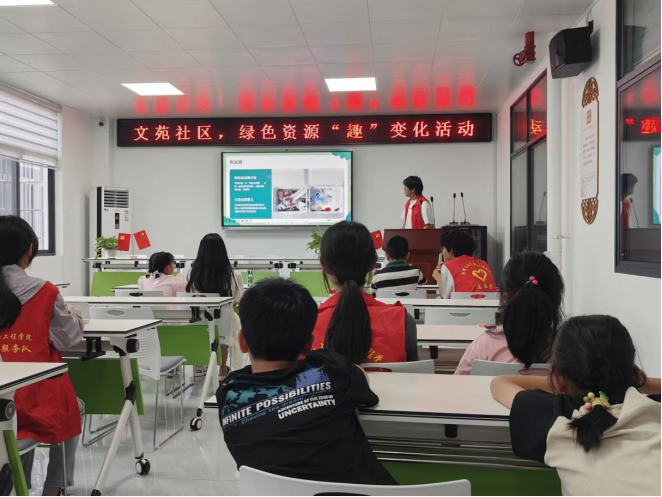 活动开始,志愿者通过动画短片《垃圾星球》引入主题,随后通过PPT宣讲介绍塑料瓶、纸箱、易拉罐等常见物品的分类、创意改造案例(如塑料瓶变笔筒/花盆、纸箱变书架/机器人模型)以及“收集—分类—重生”的回收三部曲。志愿者们也设置了“家里有哪些可回收宝藏”互动提问环节,增强小朋友们的参与感,倡导减少使用一次性物品、旧物改造等绿色生活习惯并发起家庭回收挑战赛,引导社区居民及儿童认识可回收资源价值,树立循环利用理念。