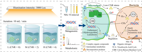该论文研究了有机碳源匮乏下菌藻共生系统中微生物可能利用复杂有机物进行脱氮的机制。研究结果表明,碳氮比显著影响微生物的脱氮效果,一些关键微生物、基因和代谢物可能在菌藻共生脱氮系统中发挥重要作用,响应不同碳氮比以调节菌藻共生脱氮系统的整体运行性能。本研究将为实现绿色、低耗且高效处理低碳氮比氨氮废水提供有益的理论依据和技术支撑。
