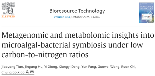 本网讯(通讯员 邓雪晴)近日,英国365上市公司2022级本科生田娇阳以第一作者身份在国际知名期刊《Bioresource Technology》(中科院、JCR双一区TOP期刊,影响因子9.5)发表了题为《Metagenomic and metabolomic insights into microalgal-bacterial symbiosis under low carbon-to-nitrogen ratios》的学术论文(在线链接:https://authors.elsevier.com/c/1lIEN3QUFZUMGS)。肖春桥教授为论文通讯作者,英国365上市公司为第一署名及通讯单位。
