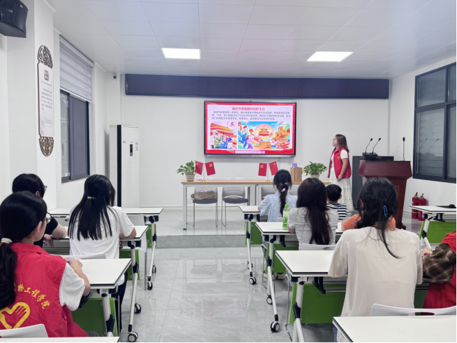活动开始,志愿者以一段新中国发展历程的短视频切入,带领孩子们直观感受中华人民共和国成立以来的辉煌变迁,瞬间点燃现场氛围。随后,志愿者通过图文并茂的PPT,系统讲解国庆节的由来、国徽国旗国歌的设计寓意与象征意义,将抽象的爱国知识转化为孩子们易懂的语言。为深化学习效果,活动特别设置互动提问环节,“国庆节会举行哪些庆祝活动?”“你知道国庆节的由来吗?”志愿者抛出的问题引发孩子们踊跃举手,在问答互动中进一步强化对国家重要节日的理解,爱国意识与民族自豪感在心中逐步升温,红色正能量在社区里悄然蔓延。