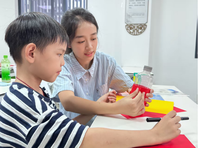 手工实践环节成为本次活动的“亮点时刻”。志愿者提前准备好矿泉水瓶、彩色卡纸、丝带等材料,手把手指导孩子们制作国庆主题灯笼。孩子们专注地裁剪、粘贴、装饰,不时相互交流创意,活动现场充满欢声笑语。经过一番巧思制作,一个个造型别致、洋溢着节日气息的灯笼陆续完成。捧着亲手打造的作品,孩子们脸上满是自豪。这堂“沉浸式”手工课,让爱国情怀从课堂走向实践,以更直观、更温暖的方式浸润孩子们的心灵。活动结束后,大家共同清扫了活动场地,让“爱护环境、责任担当”的理念与爱国教育深度融合。
