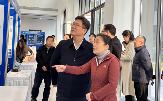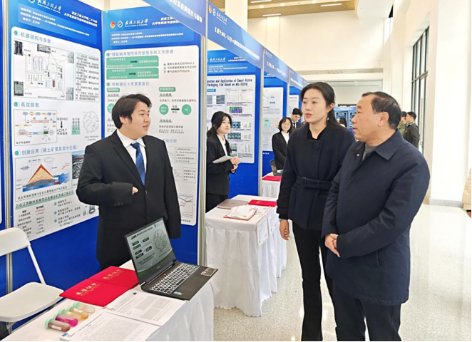 公司党委书记汪伟、董事长张彦铎、公司党委副书记李志旭、副董事长马小龙等校领导,各职能部门负责人、校外行业专家及师生代表参观成果展。公司党委书记孔海霞介绍了公司今年在学科竞赛上取得的显著成绩。项目团队成员围绕项目的核心技术原理、创新突破点及落地应用价值展开生动讲解——从“微生物降解水体污染物”的前沿技术,到“智能活性包装膜”的实践方案,每一项都紧扣生态保护与民生改善现实需求,彰显了环生学子以科创回应时代使命与环保重任的担当。