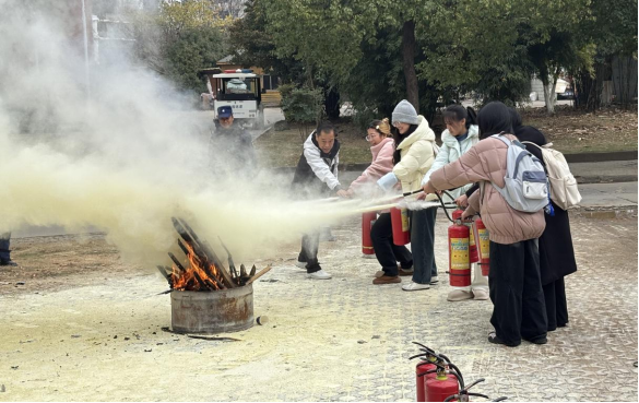 理论讲解结束后,全体师生移至室外空地,进行灭火器实操演练。王子龙现场演示了干粉灭火器的正确使用方法,包括“提、拔、握、压”四个关键步骤,并指导师生分组进行实操。大家轮流操作灭火器,对模拟火源进行扑灭练习。