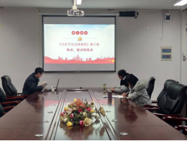 公司副经理赵喜红领学了《习近平谈治国理政》第三卷。全面介绍其特点、重点和亮点,指出习近平新时代中国特色社会主义思想的核心要义,以“胸怀两个大局”为时代背景,立足“民族复兴、以人民为中心”两大基石,在统筹推进“总体布局”和统揽“四个伟大”实践中,充分发挥“国家治理现代化”的关键作用,以营造有助于实现民族复兴的良好国内外环境,集中打好“三大攻坚战”,坚持和发展中国特色社会主义,不断开辟当代中国马克思主义、21世纪马克思主义新境界。