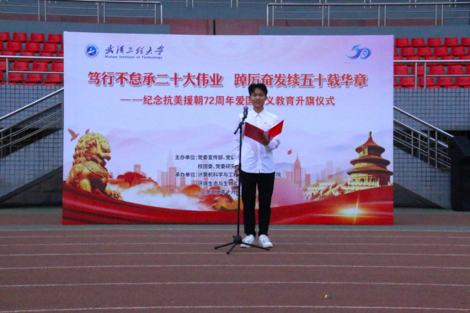 计算机公司2022级计算机6班施以慷作为员工代表发言。他号召青年员工要传承并弘扬抗美援朝精神,铸就中华民族伟大复兴梦。让青春在全面建设社会主义现代化国家的火热实践中绽放绚丽之花。