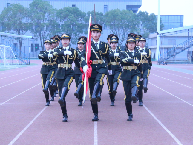 国旗护卫队着装整齐,迈着有条不紊的步伐,护送五星红旗入场。伴随着国歌的响起,全体师生行注目礼,奏唱国歌,注视着五星红旗冉冉升起。