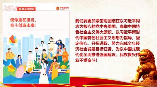 会上,郑冬洁从2023年工作回顾、2024年发展主要预期目标、2024年政府工作任务等方面带领学习了2024政府工作报告,希望同学们志存高远、脚踏实地,把课堂学习和国家发展紧密结合起来,练就过硬本领,为实现中华民族伟大复兴作出应有贡献。同时就员工党建工作提出要求:一是提高政治站位,改进工作作风,各支部要求实效、重实干,树新风、展新貌,以身教作执行的榜样,为全院员工树立改进作风、狠抓落实的典范,发挥“头雁效应”。二是加强支部标准化、规范化建设,落实基层党建工作责任制,严守党员发展纪律、严格坚持发展标准、严肃履行入党手续。三是加强员工党员队伍建设,严把党员发展质量,要加强对入党积极分子的培养,深入推进党员示范岗挂牌、党员示范寝室创建和党员宿舍导师制,充分发挥党员模范带头作用。四是要激发支部活力,打造“一支部一特色”的党建品牌。高标准完成“规定动作”,高质量完成“自选动作”,创新主题党日活动形式,不断丰富活动内容,让主题党日“活”起来。