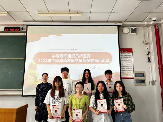 卢宜青为2023年下半年新发展党员授予党员示范岗牌子,希望党员们带头争先创优、遵章守纪、承诺践诺,发挥先锋模范作用,做“合格”党员。